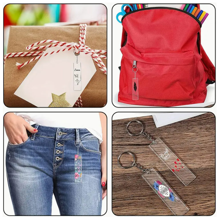 - Rectangular shape acrylic blank, tassel, keychain ring and jump ring ~ 60mm x 40mmm x 2mm. Hole ~ 3mm.