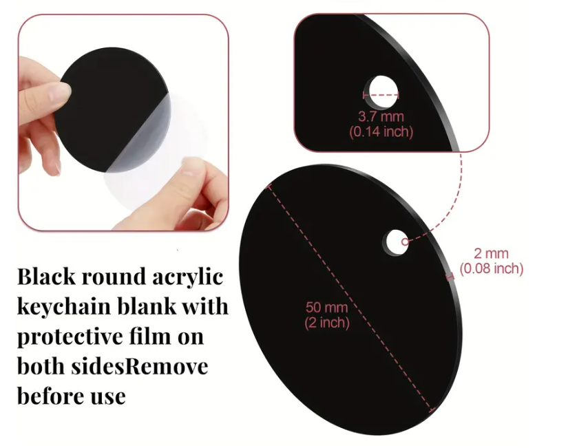 - Clear circle ~ 50mm x 50mm x 2mm. Hole ~ 3mm.