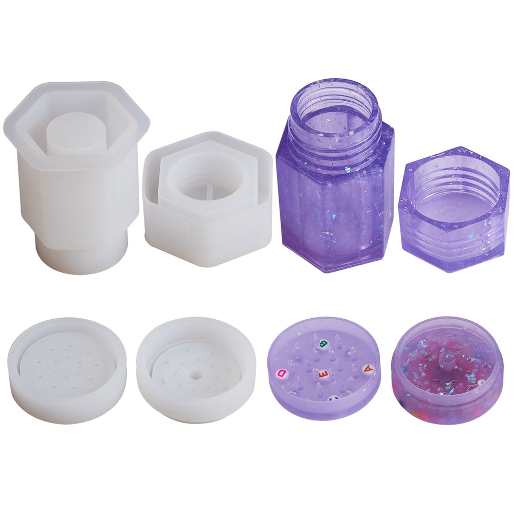 2 sets 2 styles, hexagonal prism & flat round storage box, bottle container silicone mold set.