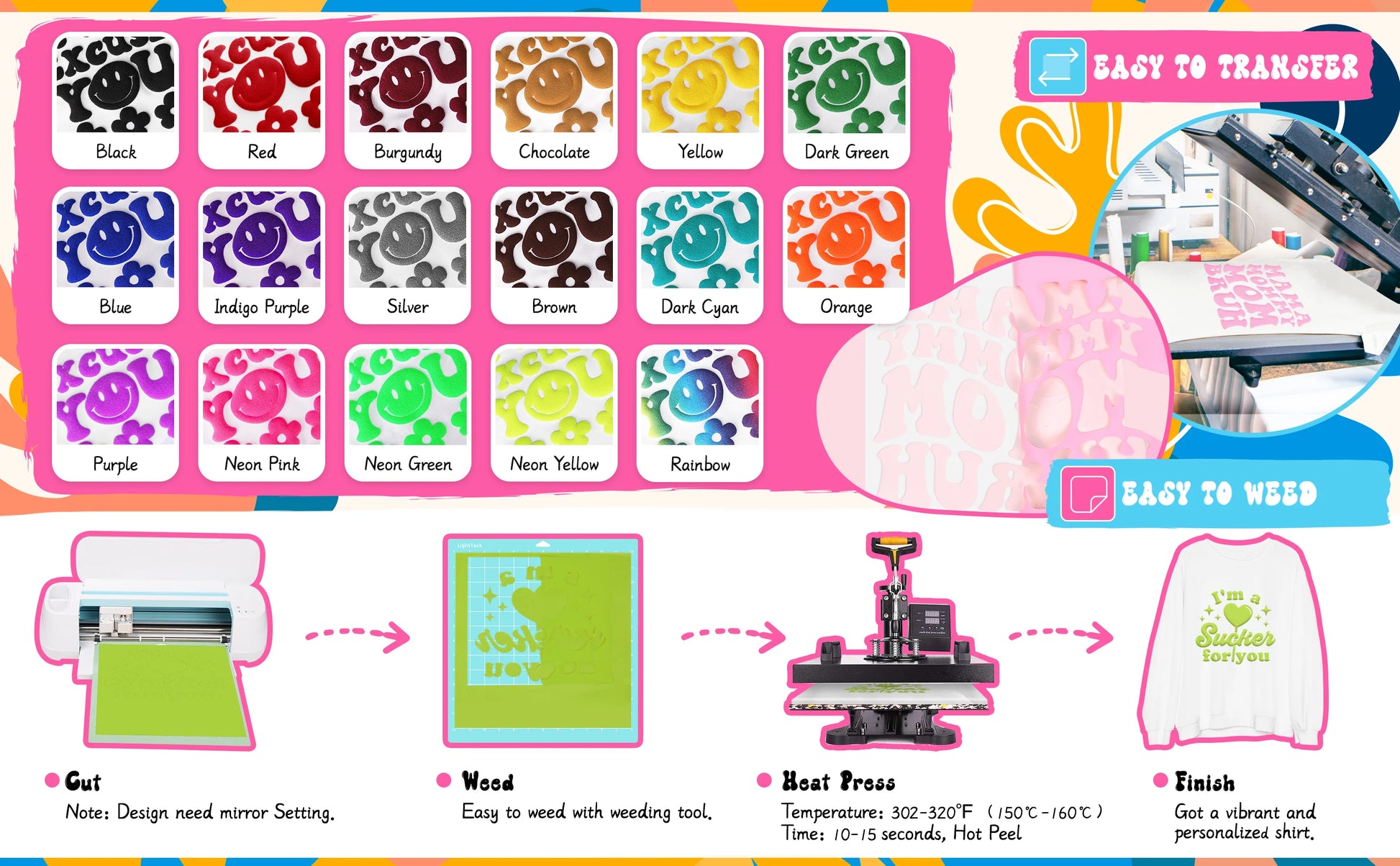 - Easy to use: Puff heat transfer vinyl is an all-in-one product that requires no additional carrier or adhesive.